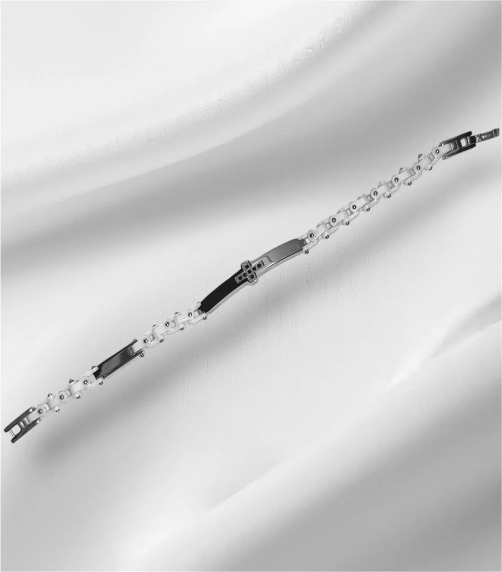 Realizzato in acciaio lucido e ceramica nera o bianca, presenta al centro una croce elegante impreziosita da zirconi neri, simbolo di forza interiore e spiritualità. La texture liscia della ceramica contrasta con la lucentezza dell’acciaio, dando vita a un design moderno, versatile e di grande personalità.