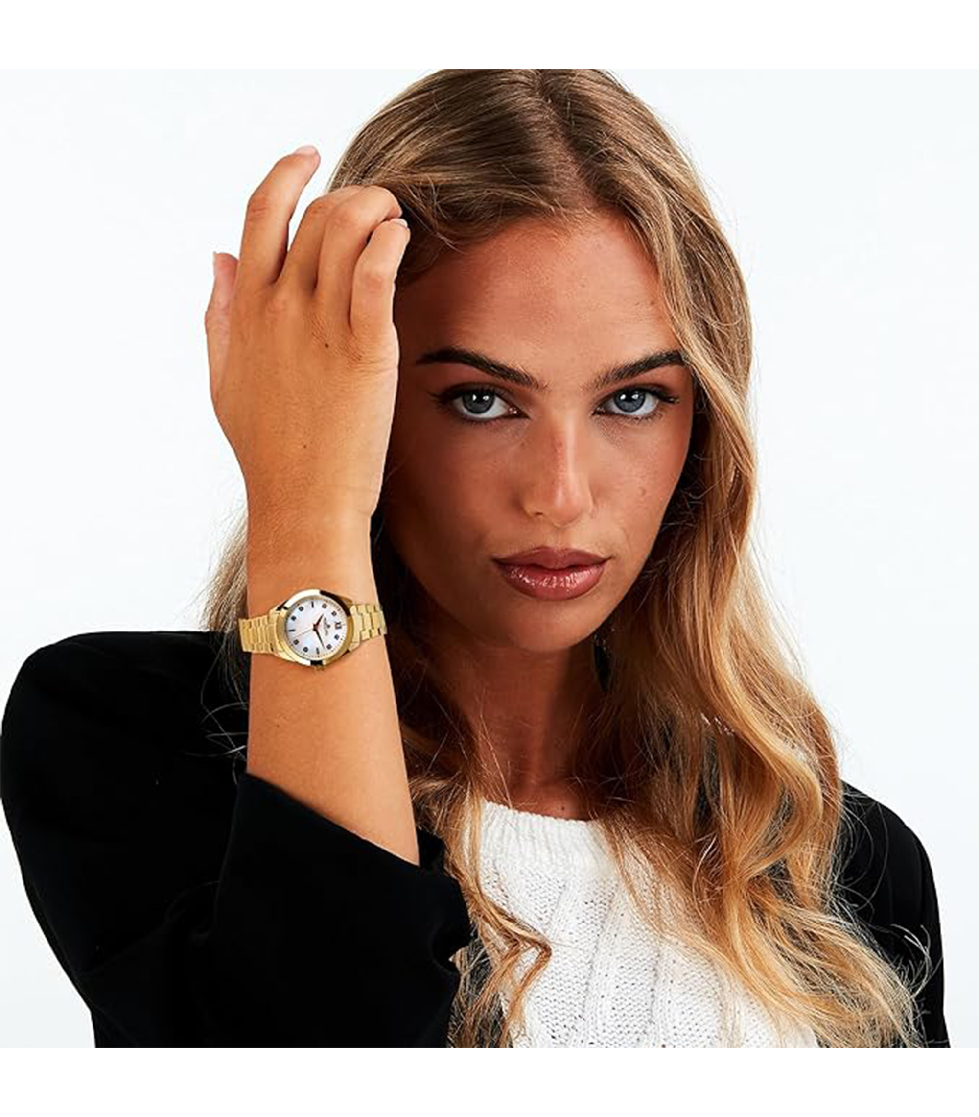 Realizzato in acciaio inossidabile color oro, questo segnatempo riflette la luce con delicatezza, trasformando ogni gesto in un dettaglio di stile. Il cinturino in acciaio con fibbia diver e blocco di sicurezza abbraccia il polso con comfort e sicurezza, mentre la chiusura a scomparsa con fermo di sicurezza aggiunge un tocco di discrezione e praticità.