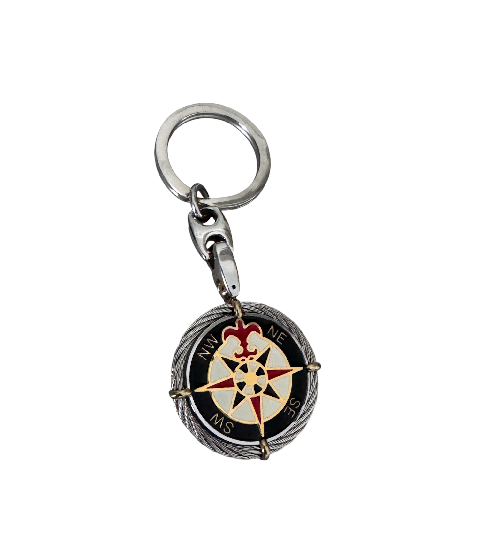 Questo portachiavi non è solo un oggetto funzionale, ma un vero simbolo di orientamento e libertà. Caratterizzato da una dettagliata Rosa dei Venti con finiture smaltate a contrasto, è incorniciato da un elegante motivo a corda nautica in acciaio intrecciato, richiamando la tradizione marinara più autentica.