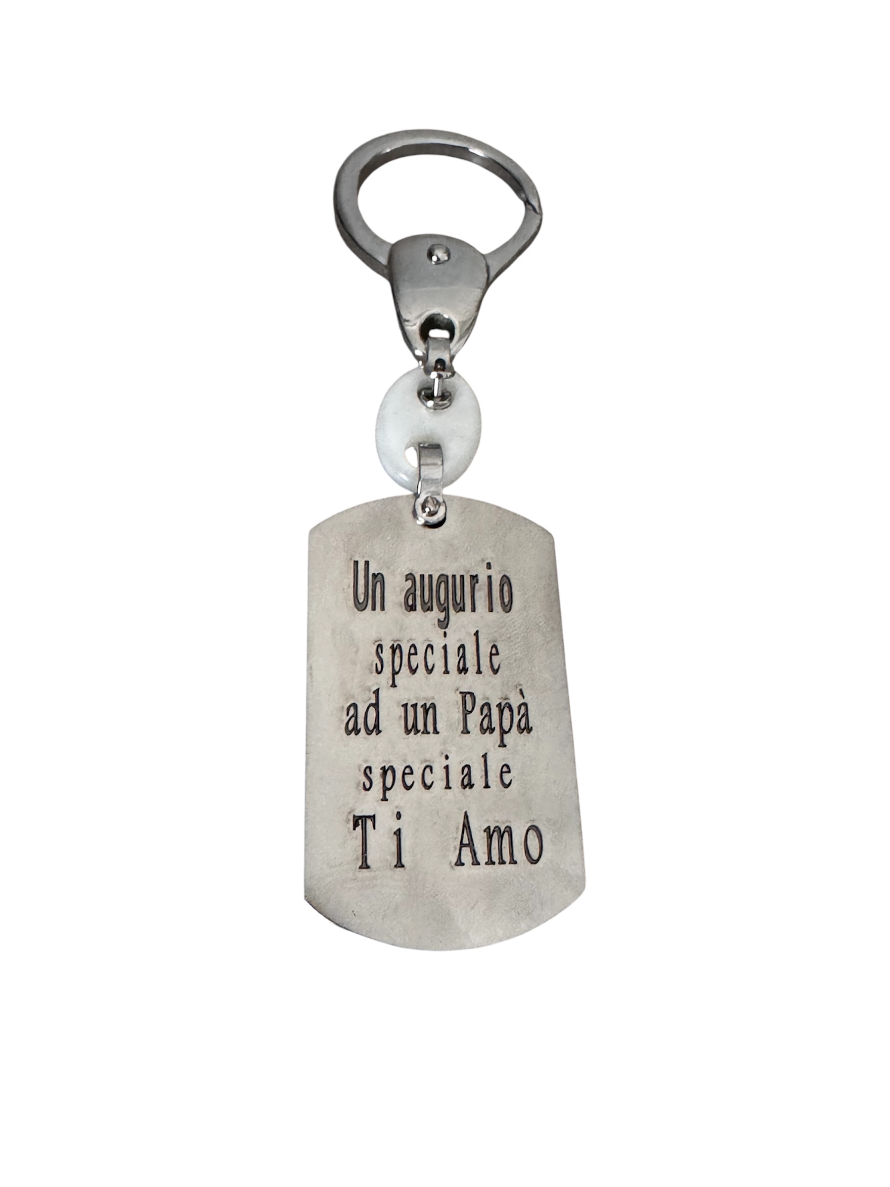 Esprimi tutto il tuo bene con questo esclusivo portachiavi a piastrina in acciaio inossidabile. Caratterizzato da un design sobrio e maschile, questo accessorio è pensato per resistere alla sfida del tempo, proprio come il legame tra un figlio e un genitore. La finitura satinata conferisce un aspetto moderno ed evita che le impronte restino visibili.